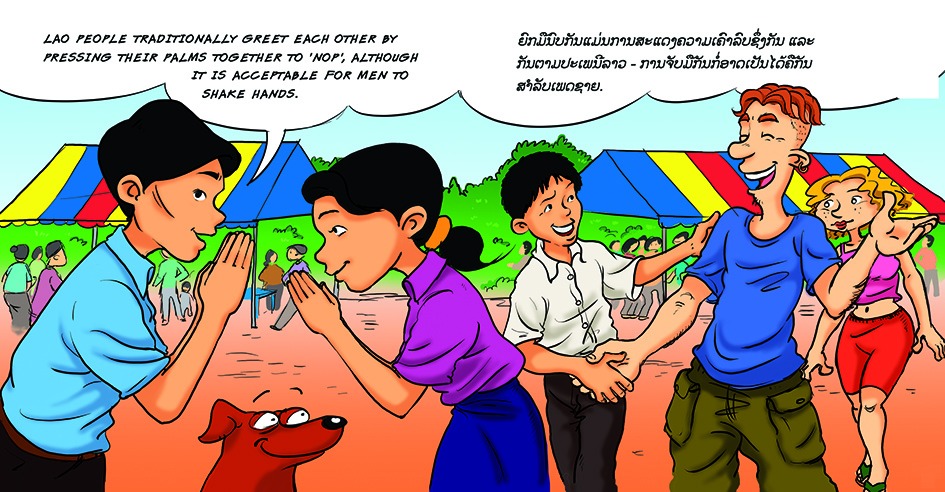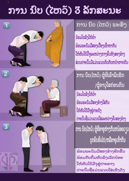 A formal greeting for most Lao people is the “Nop” (joining one’s hands together in a praying gesture at chin level). Handshakes are also commonly used among male friends and with foreign visitors.